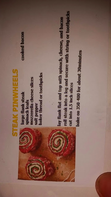 We used two thin pan frying steaks, seasoned the tops with salt, pepper, and adobo,then layered spinach, cheese, bacon, and a tiny bit more cheese. Rolled then up, 4 toothpicks, then cut into slices.